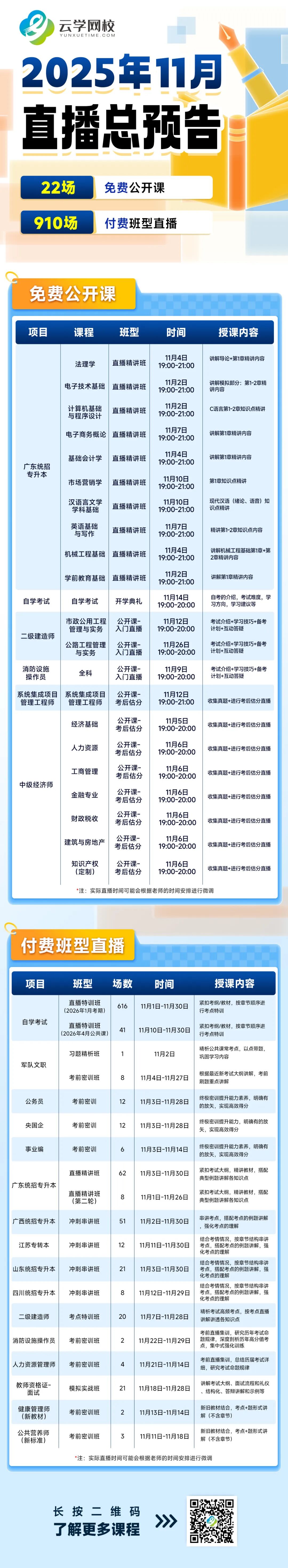 2025年11月,云学网校直播课程共932场,免费直播课程22场,面向已开通相关班型学员的直播课程910场。